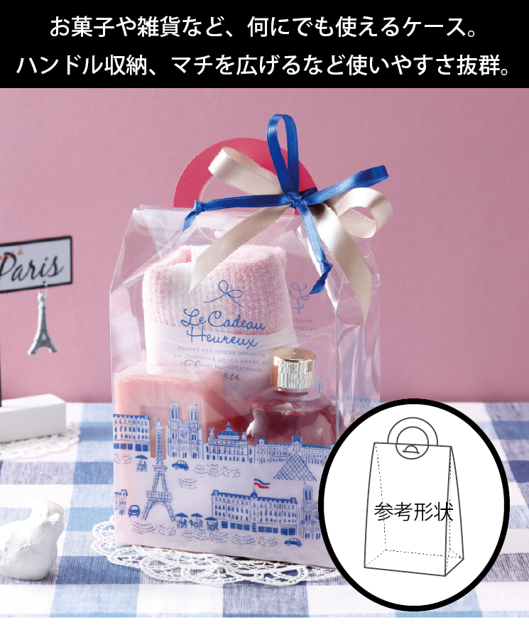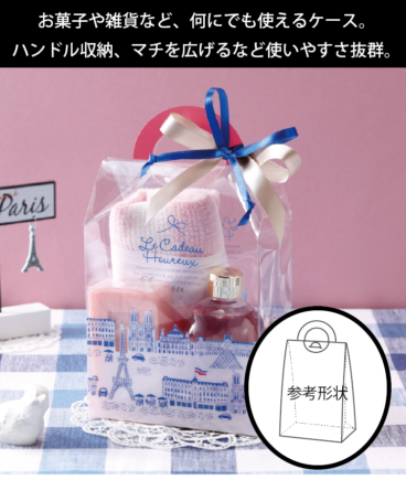 お菓子や雑貨など、何に使っても商品が映えること間違いなしの印象的なパッケージ。ハンドルが収納出来たり、マチを広げる機能も付いているので使いやすさも抜群のアイテムです。