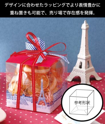 デザインに合わせたラッピングでより一層表情豊かに売り場で存在感を発揮してくれます。キューブ型を生かした重ね置きも可能なので、ピラミッド型に陳列すればディスプレイ効果も期待できます。
