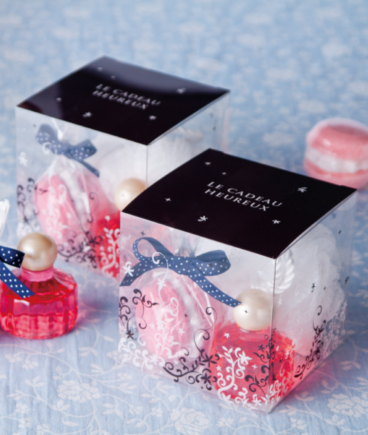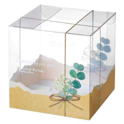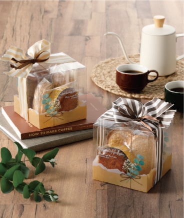 デザインに合わせたラッピングでより一層表情豊かに売り場で存在感を発揮してくれます。キューブ型を生かした重ね置きも可能なので、ピラミッド型に陳列すればディスプレイ効果も期待できます。
