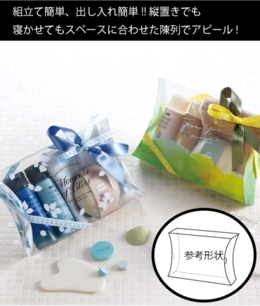 丸みをおびた形状で売り場でも注目度アップ!縦置き・横置き・吊り下げなど、売り場の陳列スペースに合わせたセレクトが出来ます。